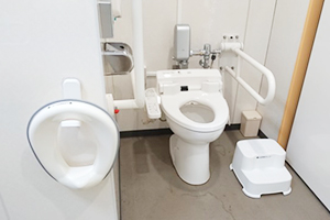 園内3か所のバリアフリートイレの中に、こども用の補助便座(着脱式)とステップを備え付けています。