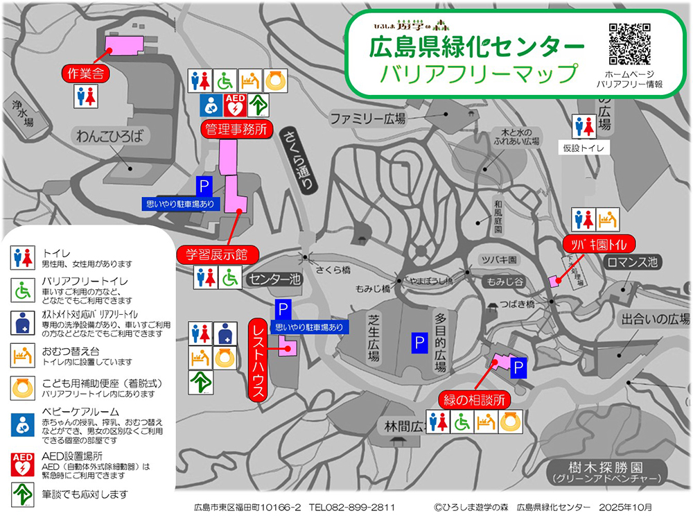 場所レストハウス(バリアフリートイレ)・管理事務所(バリアフリートイレ)・緑の相談所(バリアフリートイレ)・ツバキ園トイレ(男子トイレ、女子トイレ)