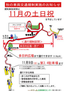 ・11/9は多目的広場でイベントが開催されます。このため、この日は交通規制範囲が拡大されるため、園内を循環するシャトルバスを運行します。各駐車場からの移動にはシャトルバスをご利用ください。シャトルバスの時刻表は、後日ホームページ上でお知らせします。