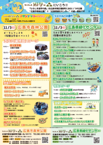 ⇓こちらのチラシは広島県緑化センターのイベント(右側の緑色のところ)と広島市森林公園のイベント(左側の黄色のところ)を掲載しています。